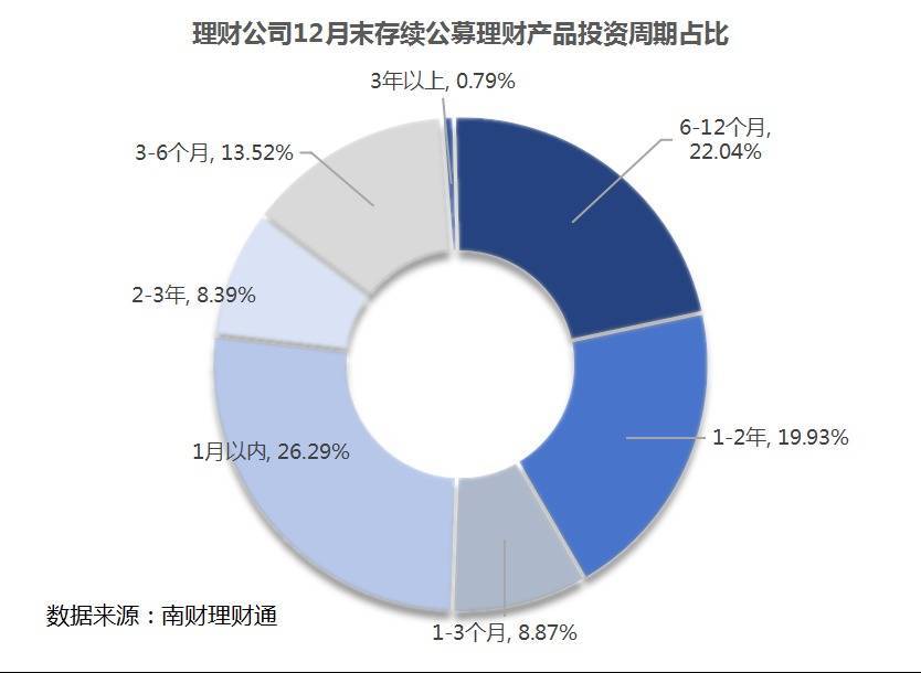 投资周期:12月末,1月以内期限和6—12个月期限的公募理财产品存续数量最多,占比分别达到26.29%和22.04%;其次是1—2年和3—6个月期限的产品,分别占19.93%和13.52%。1—3个月和2—3年期限的产品存续数量合计不足20%,3年以上期限产品数量占比不足1%。