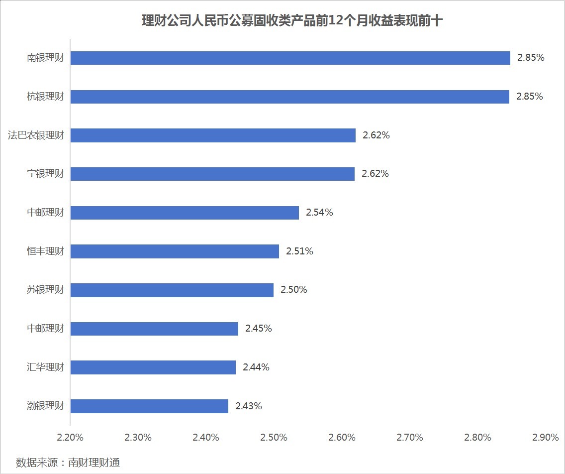 具体到人民币公募固收类产品收益表现方面,南银理财、杭银理财2025年的收益表现最好,平均净值增长率均超过2.8%,分别为2.848%和2.846%。