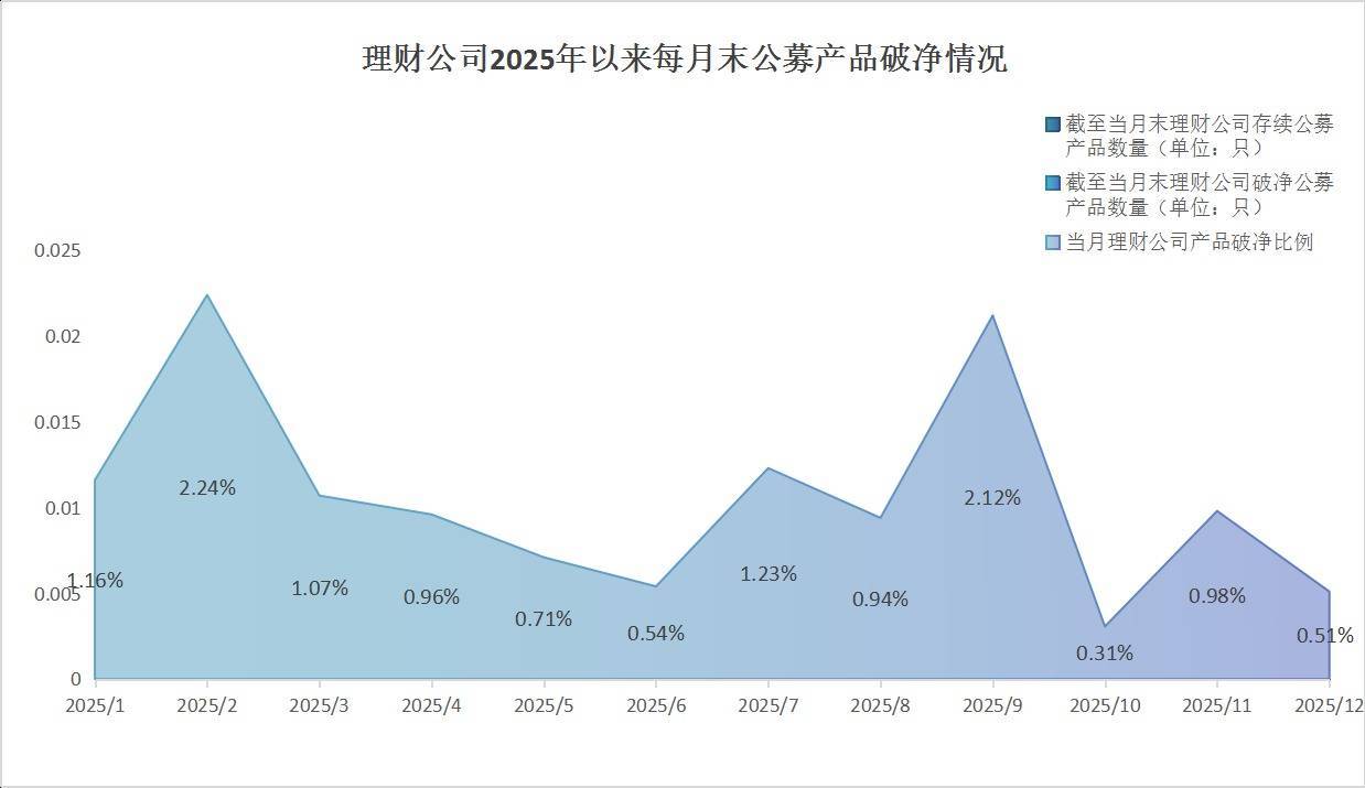 破净情况:南财理财通数据显示,截至12月末,32家理财公司共计存续28363只公募理财产品,其中145只产品累计净值低于1,破净比例下降至0.51%。