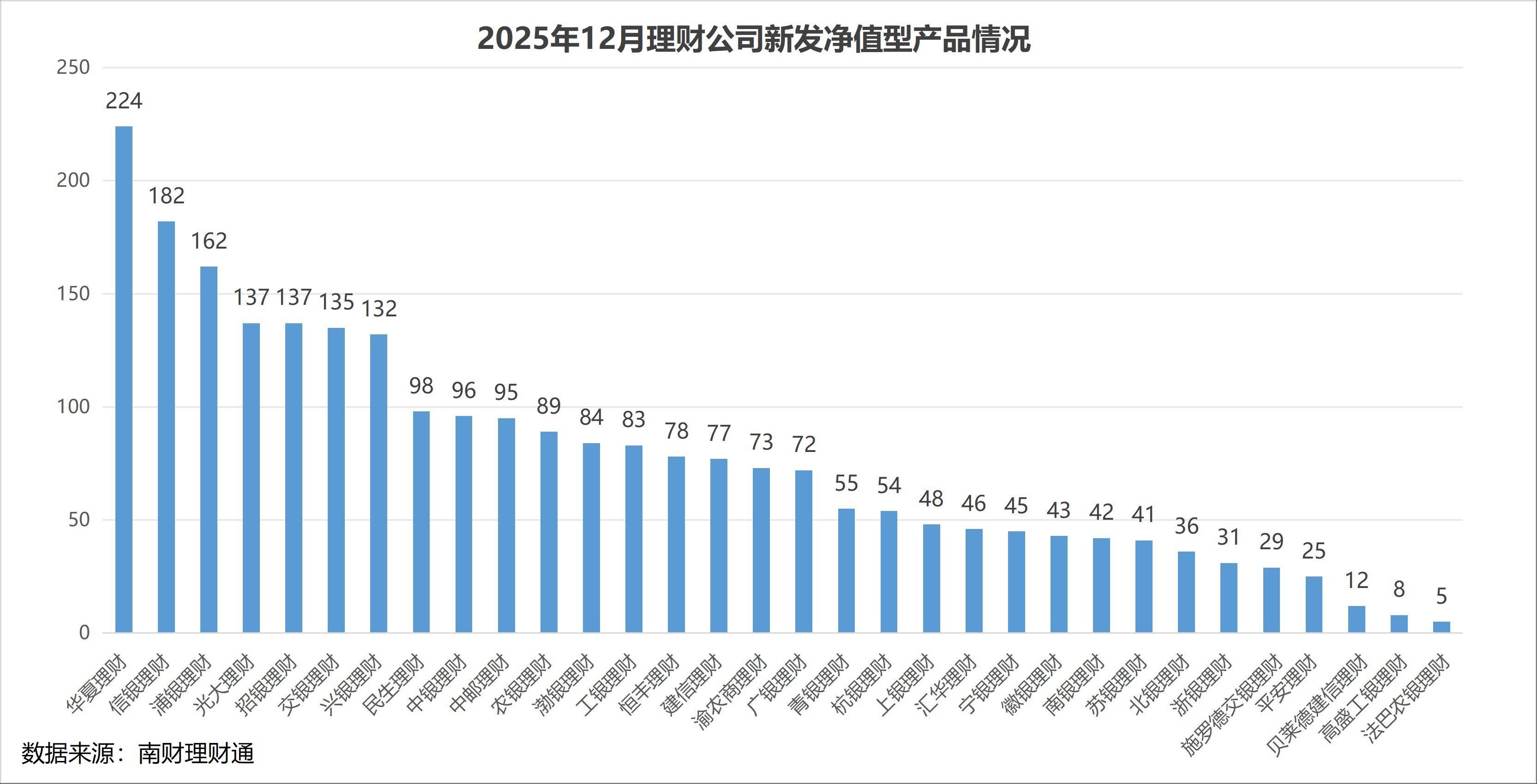 产品数量:南财理财通数据显示,2025年12月,32家理财公司合计发行了2474只理财产品(同一产品登记编码下不同份额合并计算),环比11月份的2107只增长了17.42%。发行数量位居前三的理财公司分别为华夏理财、信银理财和浦银理财,发行数量分别为224只、182只和162只。