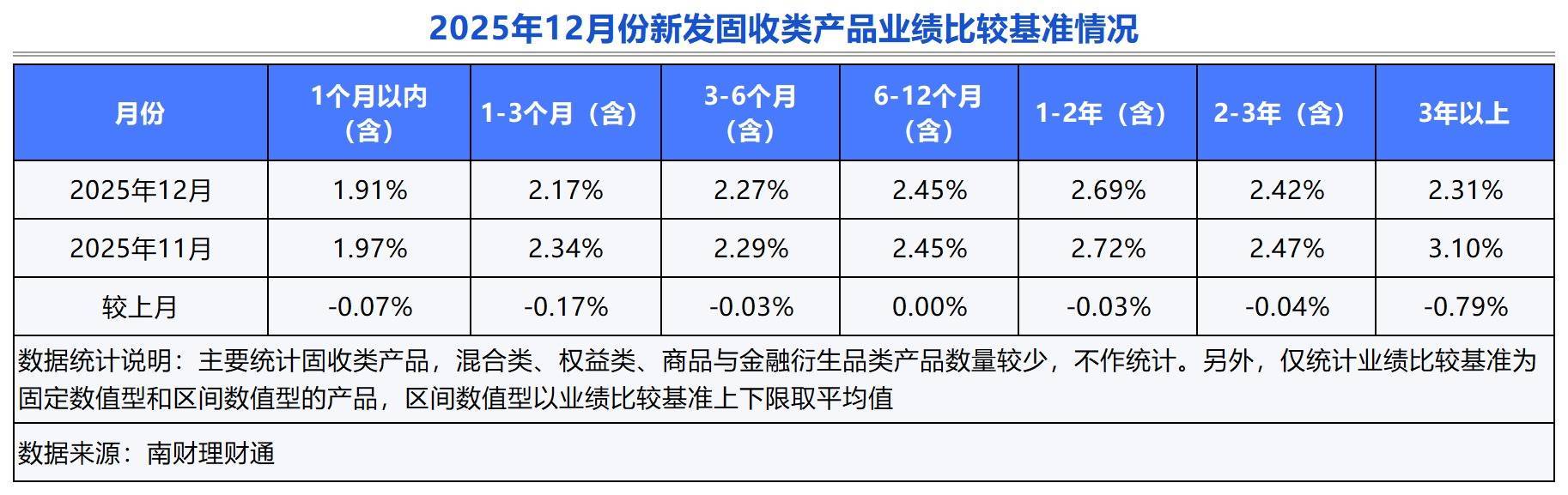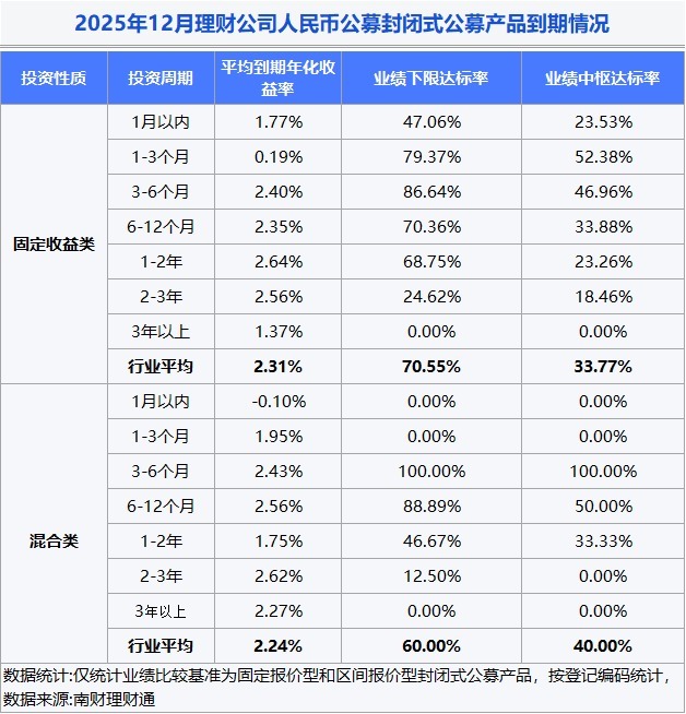 到期情况:2025年12月,32家理财公司合计有1160只(按登记编码核算)封闭式人民币理财产品到期。达标率方面,到期产品业绩下限达标率为69.97%,业绩中枢达标率为34.13%。从到期产品业绩水平看,固定收益类封闭式人民币公募产品年化收益率均值为2.31%,混合类产品为2.24%。