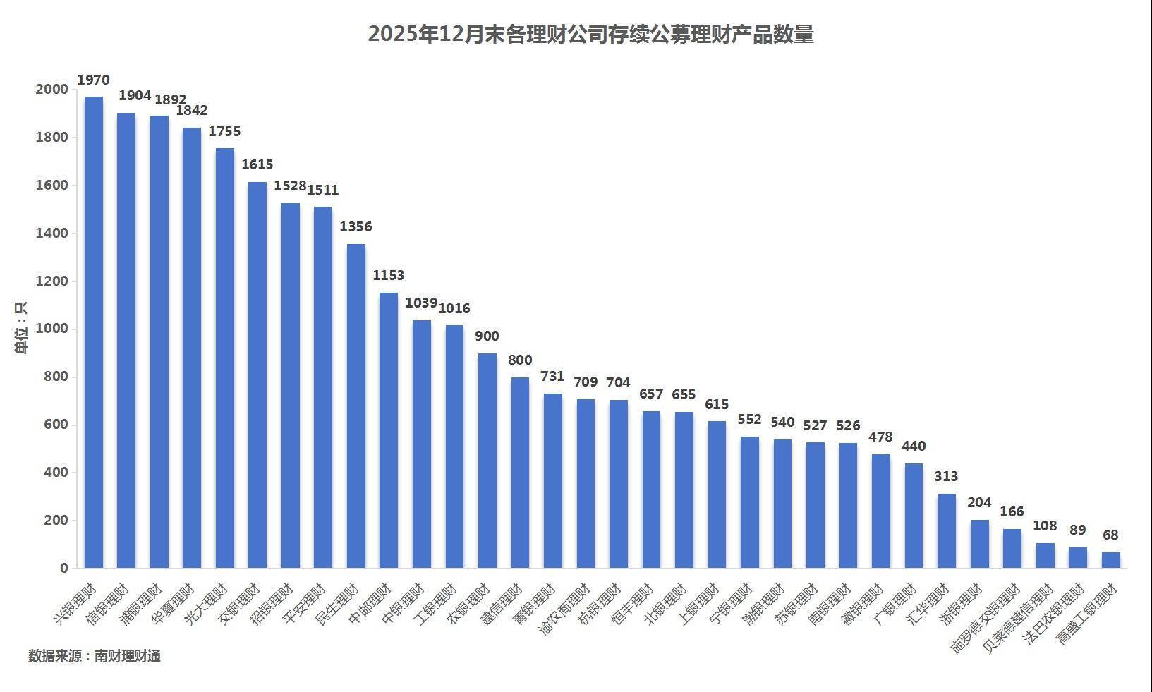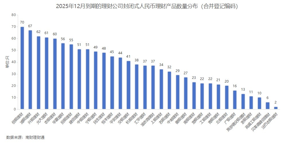 产品数量:据南财理财通数据,2025年12月,32家理财公司合计有1160只(按登记编码核算)封闭式人民币理财产品到期。分投资性质看,固收类、混合类、权益类分别有1093只、53只、12只产品到期,商品及金融衍生品类理财有2只到期。分募集方式看,公募型产品数量966只,私募型产品194只。信银理财、浦银理财、兴银理财到期产品数量位居前三。