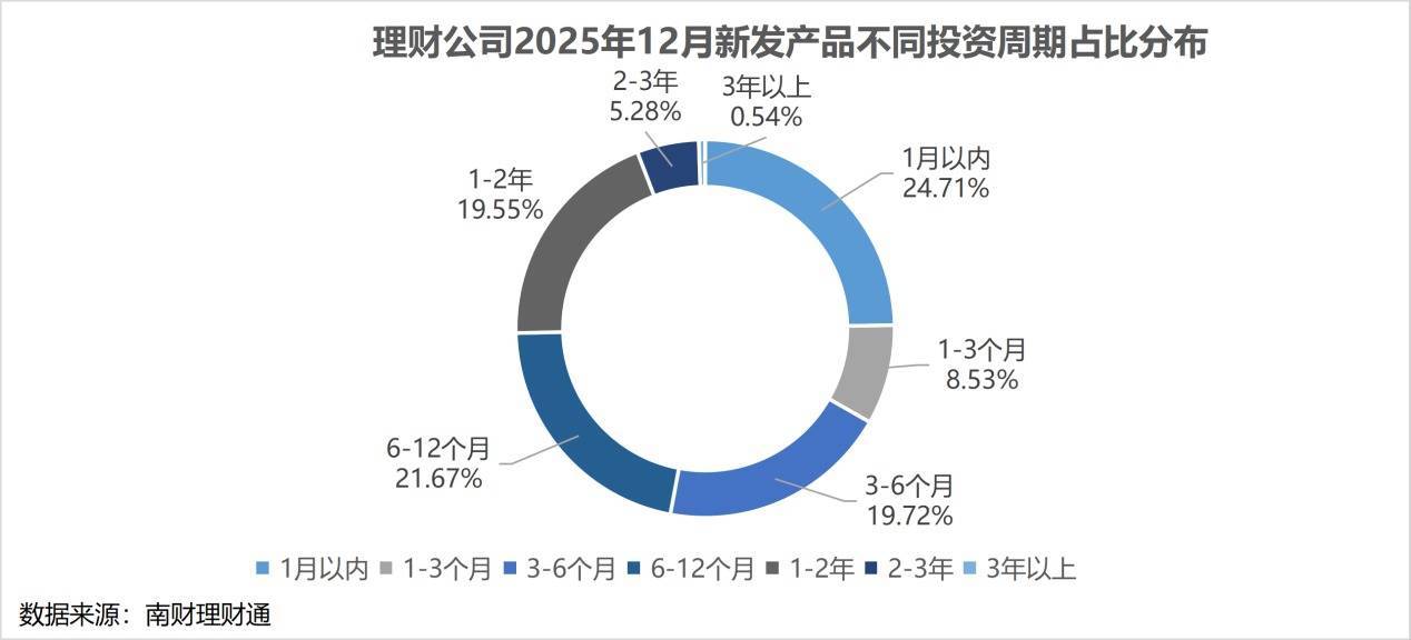 从投资性质上看,理财公司2025年12月新发固收类产品数量占比达到96.5%,混合类产品和权益类产品分别占比2.7%和0.9%。以往固收类产品比例多数维持在98%以上,如今理财公司积极发力多资产多策略投资,混合类和权益类产品的占比不断提升,固收类产品比例降低到96%左右。