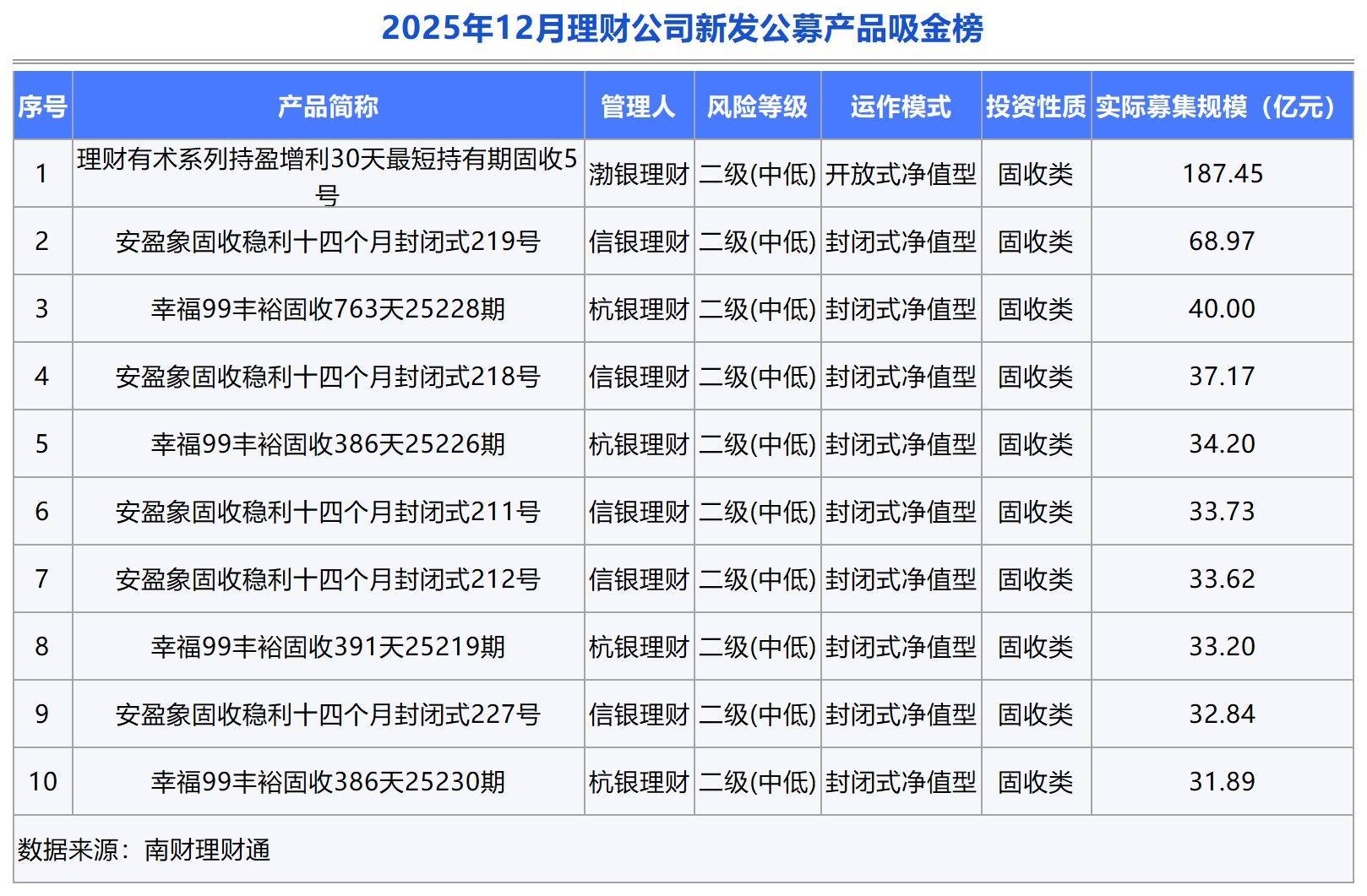 单品表现:12月份理财产品募集规模分化显著,渤银理财“理财有术系列持盈增利30天最短持有期固收5号”成为吸金黑马,募集规模高达187.45亿元,在银行理财产品中实属罕见。其余九只上榜产品募集规模均为两位数,信银理财安盈象固收稳利系列保持一贯的吸金能力,5只产品进入榜单前十。此外,杭银理财幸福99丰裕固收系列也表现强势,4只产品进入榜单前十。